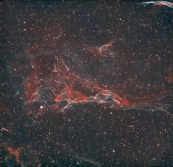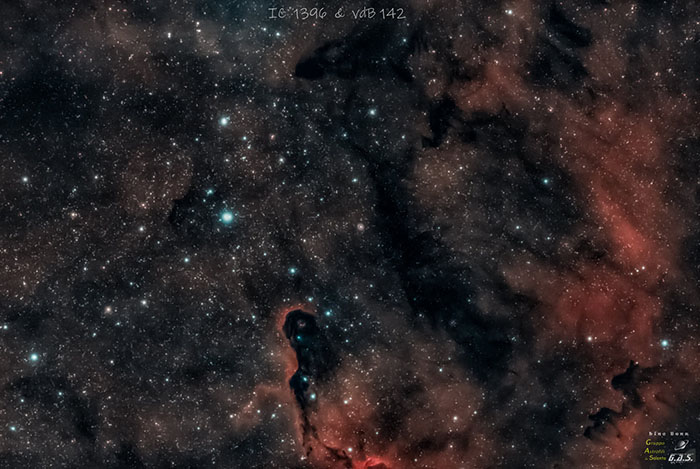21/10/2021 IC 1396 is a very scattered open cluster associated with a large diffuse nebula, visible in the boreal constellation of Cepheus; it is located in a stretch of the Milky Way partially obscured by dense banks of dark nebulae, in a galactic region rich in dust and neutral gases with associated young and hot blue stars. A particular dark nebula that overlaps the object, vdB 142, is also called the Elephant's Proboscis is about 3000 light-years away from the Sun. Photo 44x300 "Tele Svbony SV503 and 102/714 flattened, Cam Qhy294c pro with L-enhance filter, phd2 guide with tele 60/240 and asi 224 with Svbony uv ir cut filter on Heq5pro synscan, NINA acquisition with Stellarium support. DSS sum Pixi + Photoshop + Camera Raw processing. Clear Skies