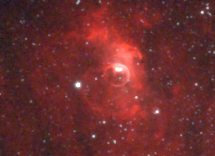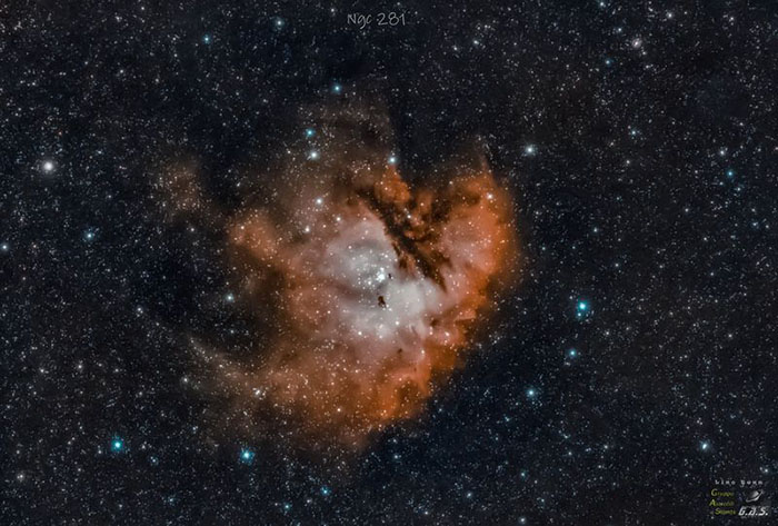 19/20 October 2021 NGC 281 is a visible emission nebula in the constellation of Cassiopeia; surrounds the open cluster IC 1590. It is sometimes called the Pacman Nebula. It is located 1.5 degrees east of the star α Cassiopeiae; powerful tools are needed to be able to identify the nebula, which is certainly the most important object, given that the cluster associated with it is formed by a few stars and dominated by a double star of eighth magnitude. The nebula appears clearly furrowed by a dark vein, which crosses it in an east-west direction; perpendicular to this, another is identified, facing south: a "T" is thus formed which deeply marks the whole object. Photographing with the full Moon Shots 76x300 "tot. 6 h and 20 min. So says DSS Tele Svbony SV503 and 102/714 and flattened, Cam Qhy294c pro with L-enhance filter, phd2 guide with tele 60/240 and asi 224 with uv ir cut filter on Heq5pro synscan, NINA acquisition with Stellarium support. DSS sum processed by Pixi + Photoshop + Camera Raw. Clear Skies