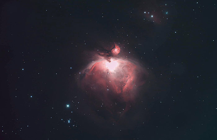The Great Orion Nebula: M42 The Orion Nebula is a picture book of star formation, from the massive, young stars that are shaping the nebula to the pillars of dense gas that may be the homes of budding stars. The bright central region is the home of the four heftiest stars in the nebula. The stars are called the Trapezium because they are arranged in a trapezoid pattern. Ultraviolet light unleashed by these stars is carving a cavity in the nebula and disrupting the growth of hundreds of smaller stars.- NASA