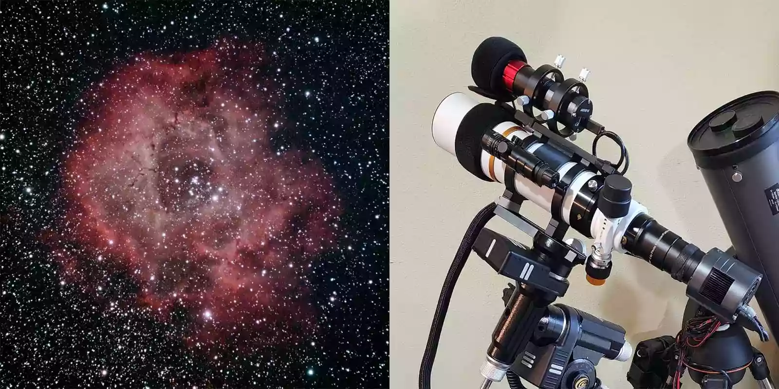 "The Rose Nebula is one of my favorites because it's easy to find. I'm still fine-tuning my equipment, but I experimented with new processing techniques to achieve this result. This first test photo used a homemade 150F5 telescope, equipped with a GSO coma compensator and Skywatcher EQ3-2 mount, along with the SVBony SV305 guiding camera and the SV405CC."