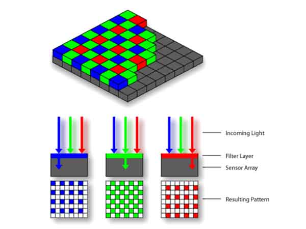 Color cameras, or OSC (One Shot Color) cameras and DSLR cameras already include a way to capture color. The camera's sensor is covered by microscopic RGB filters that form a pattern over the sensor light collectors. This pattern is called Bayer Matrix or Bayer Mosaic, invented by Bryce Bayer, working at Kodak.