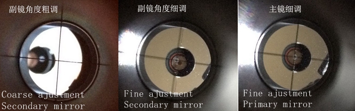 - Fine adjustment to the secondary mirror: adjusting the central ring on the primary mirror to the center of the reticle of the Cheshire by three tilt screws.