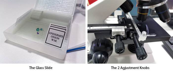 Then, choose a glass slide, you can also try to DIY a biological specimen for observation. We chose the glass slide specimen that comes in the package. We put the specimen on the mechanical moving platform and clamp it with the mobile caliper. Then we adjust the two knobs on the side of the platform. We need to keep the specimen is exactly on the small hole in the center of the platform.