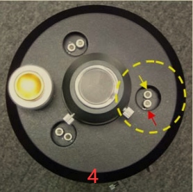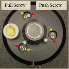 PS:There are three sets of alignment screw. Each set includes a push screw and a pull screw, indicated by red and yellow arrows, respectively. The push screwsstand out higher from the surface than the pull screws.