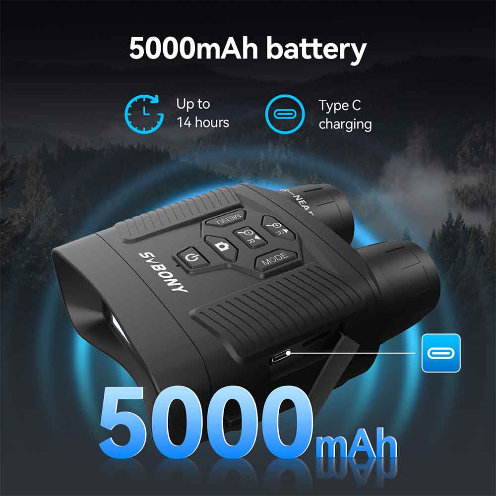 SVBONY SA206 High-Intensity Infrared Binocular Night Vision Scope boasts a 5000mAh ultra-high-capacity battery with a runtime of up to 14 hours, reducing the worry of battery depletion. Additionally, it features a convenient Type-C charging port, ensuring easy charging and extended usage of the night vision device. You can confidently engage in observation or exploration.