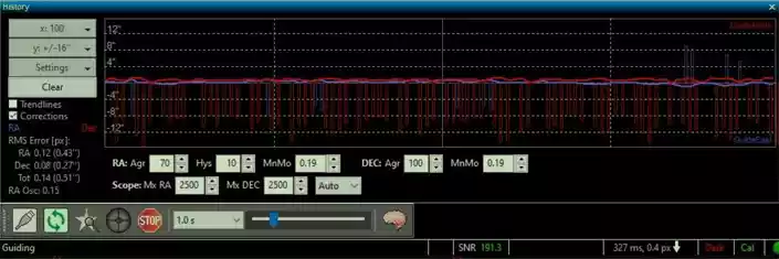 The images were taken with the ED127 and the QHY294C showed round star images with no signs of trailing. The images below show the star images as well as the PHD2 Status screen. I had intentionally left the polar alignment about 20 minutes off to force the system to make up for the polar alignment error in guiding. That is why you see multiple corrections in the PHD plot. The results were excellent.