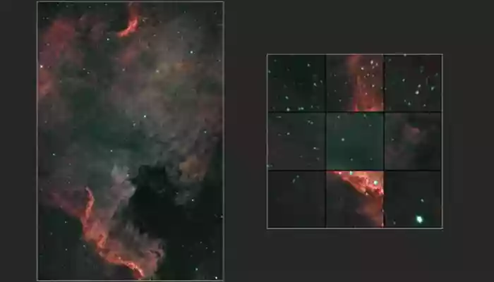 The image on the right was obtained using the Aberration Inspector Script in Pix Insight. That script produces a mosaic of enlarged images from the center, sides and corners of the NAN image to assess field curvature in the image. The shapes of the stars, especially in the corners of the NAN image indicate that the scope’s optics is not producing an optimally flat field over the camera sensor. This degree of field curvature is common in refracting telescopes without secondary optics to flatten the field.