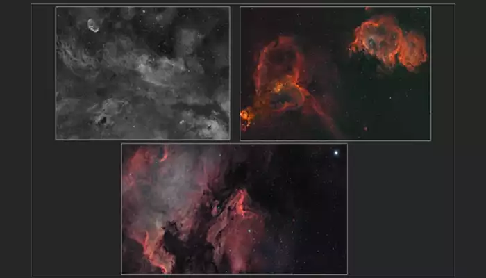 2.3 I waited until the moon had set and the constellation Cygnus was high above the horizon to image the North American Nebula. Because of the light polluted skies from my backyard, I use a multi-passband narrowband filter with my OSC camera to image emission nebula. The filter is responsive to Ha and Oiii emissions from these nebulae and effectively blocks the emissions from street lights. Figure 3 shows the processed image of the North American Nebula (NAN) I obtained from a 90-minute exposure using 2-minute subframes. The NAN image on the left is visually very appealing with very good definition and contrast especially in the bright red Ha regions of the nebula. It is a very decent image of the North American Nebula considering the relatively short exposure time with f/7 optics.