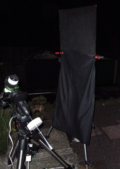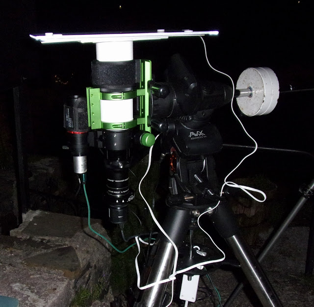 As usual, the Celestron AVX GOTO mount was placed on marks on the concrete base which give a fairly good polar alignment. AstroDMx Capture passed the time, altitude and location coordinates to the hand controller via the INDI server. The hand controller which now contained all of the correct information was set to its previous alignment and was unparked by AstroDMx Capture.