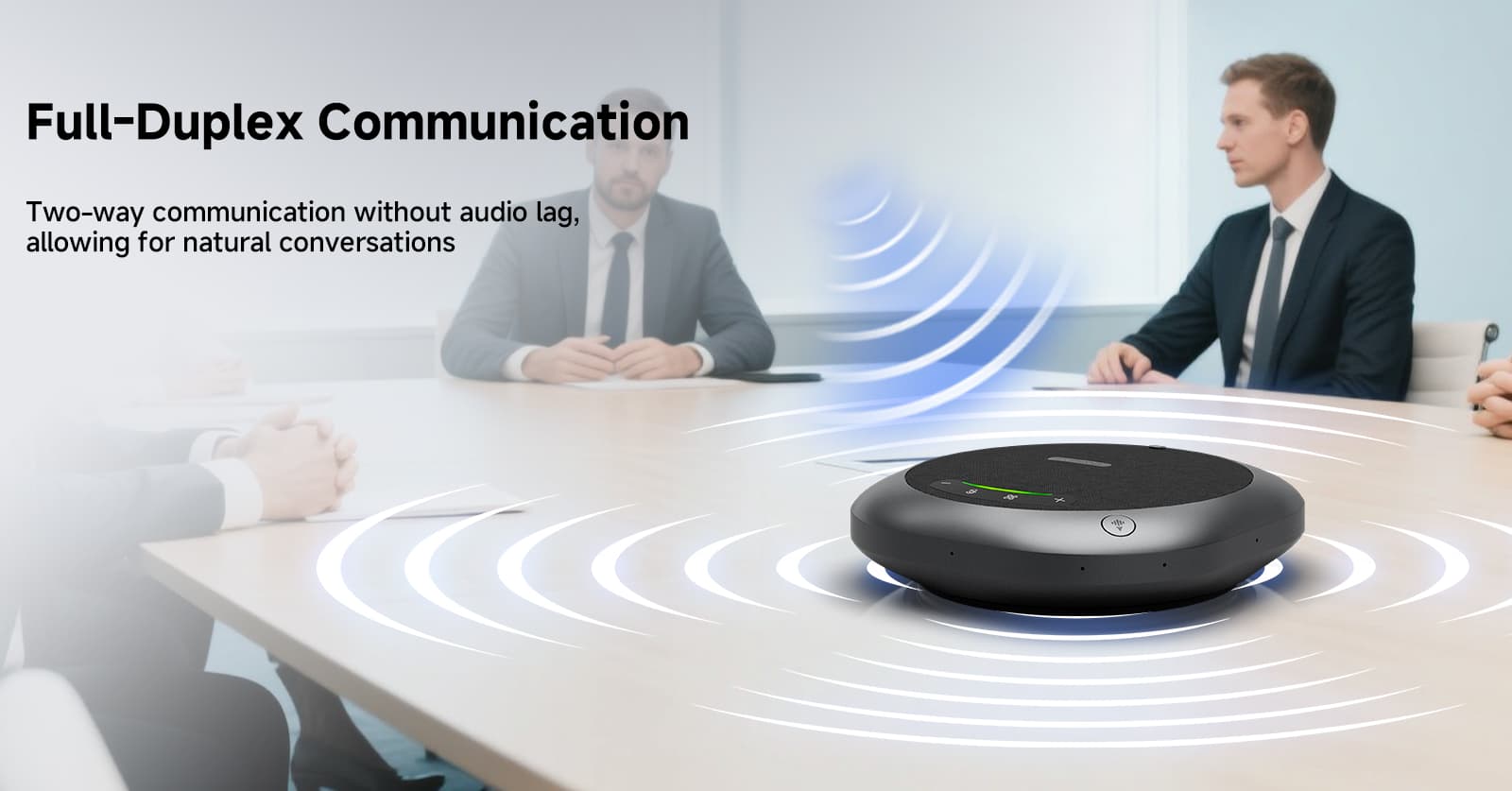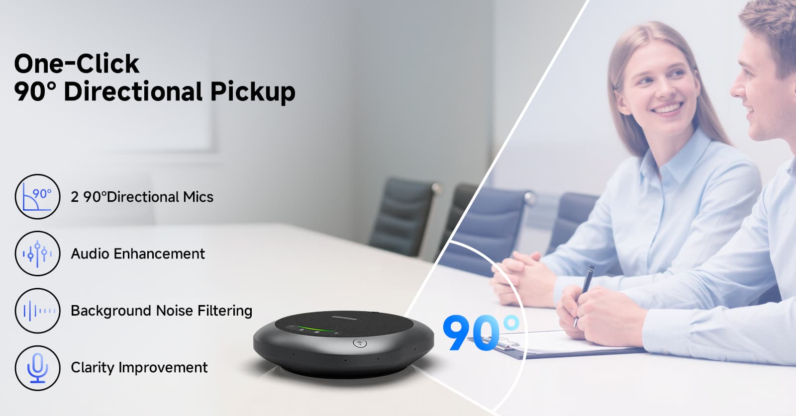 - Dual pickup modes: 360° voice pickup conference speaker is able to capture sound clearly from all directions; One-click to activate directional audio capture; picking up sound within a 90° angle while filtering out noise from other directions
