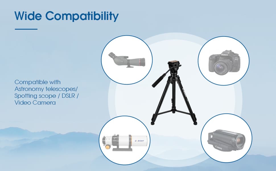 I purchased the Hydraulic Gimbal Aluminum Travel Tripod to support my 90mm OTA and Mak Pro Spotting Scope. I am very pleased with the quality and sturdiness. The fluid motion and balance make for very low vibration viewing with smooth panning. The swivel feet help with setup on uneven ground. The compact size makes it perfect for traveling and comes with a nylon carry case. I would highly recommend this tripod and SvBony for quality products.