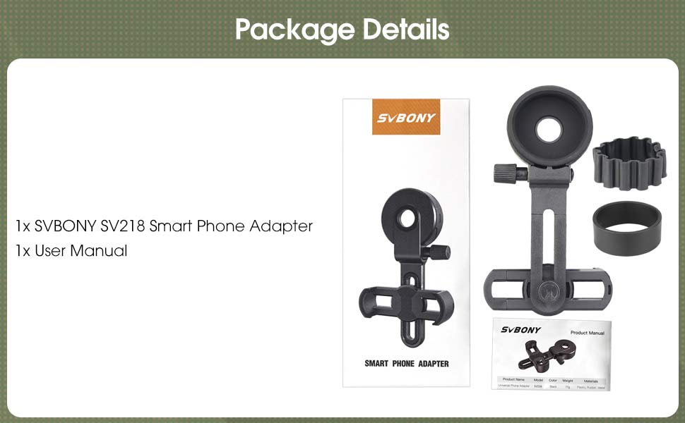 - The SV218 Compatible with binoculars, monoculars, spotting scope, microscopes or astronomical telescopes. Lens size 38.5 – 43mm.
