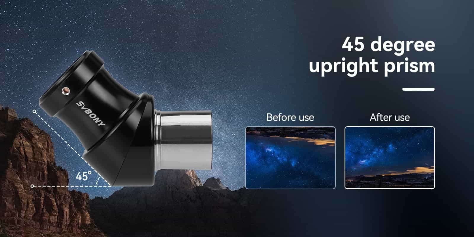 SVBONY SV222 correct image prism diagonal 45 degree is blackened and baffled inside; it can prevent internal stray light reflection.