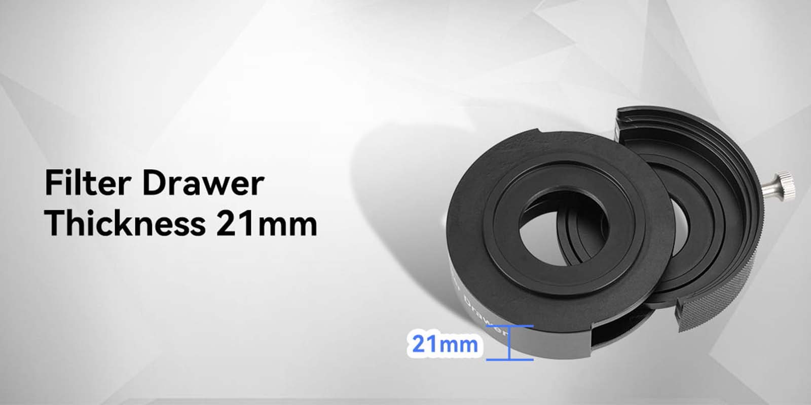 The thickness is related to back focal length; back intercept affects the quality of imaging; it limits the use of accessories and optical path length. Designed with the lock screw on the side of the filter drawer; the locking function is helpful on adjusting the tension to eliminate the gap; which is a double insurance for you.