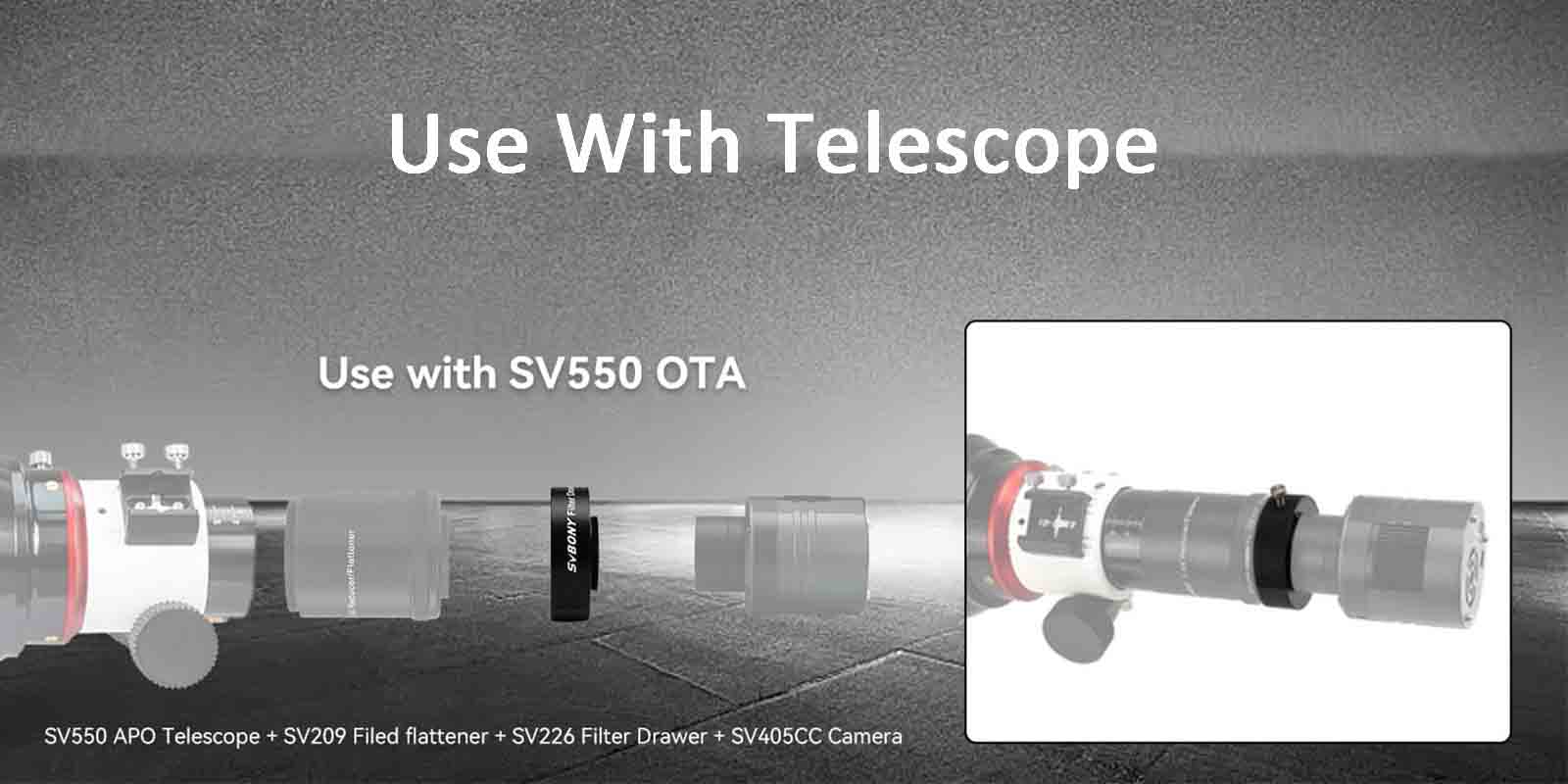 Connect the telescope to the focal reducer and drawer filter; then connect the adapter to the camera. This SV226 filter drawer can use with SV550/SV503 OTA and F9198F/F9198K astronomy cameras.
