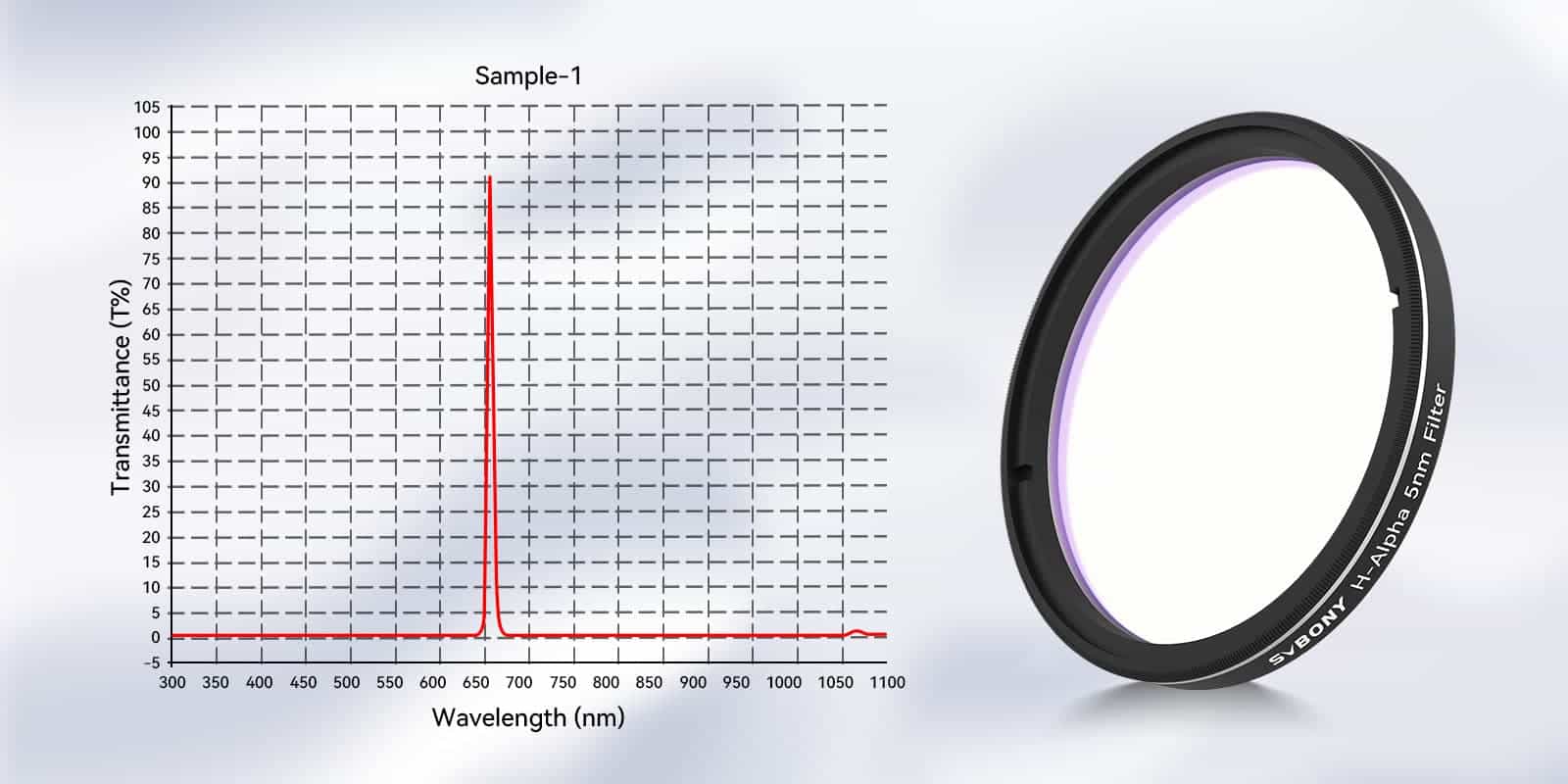 - Allowing 5nm bandwidth of light centered on a wavelength of 656.3nm to pass through; 90% transmission;