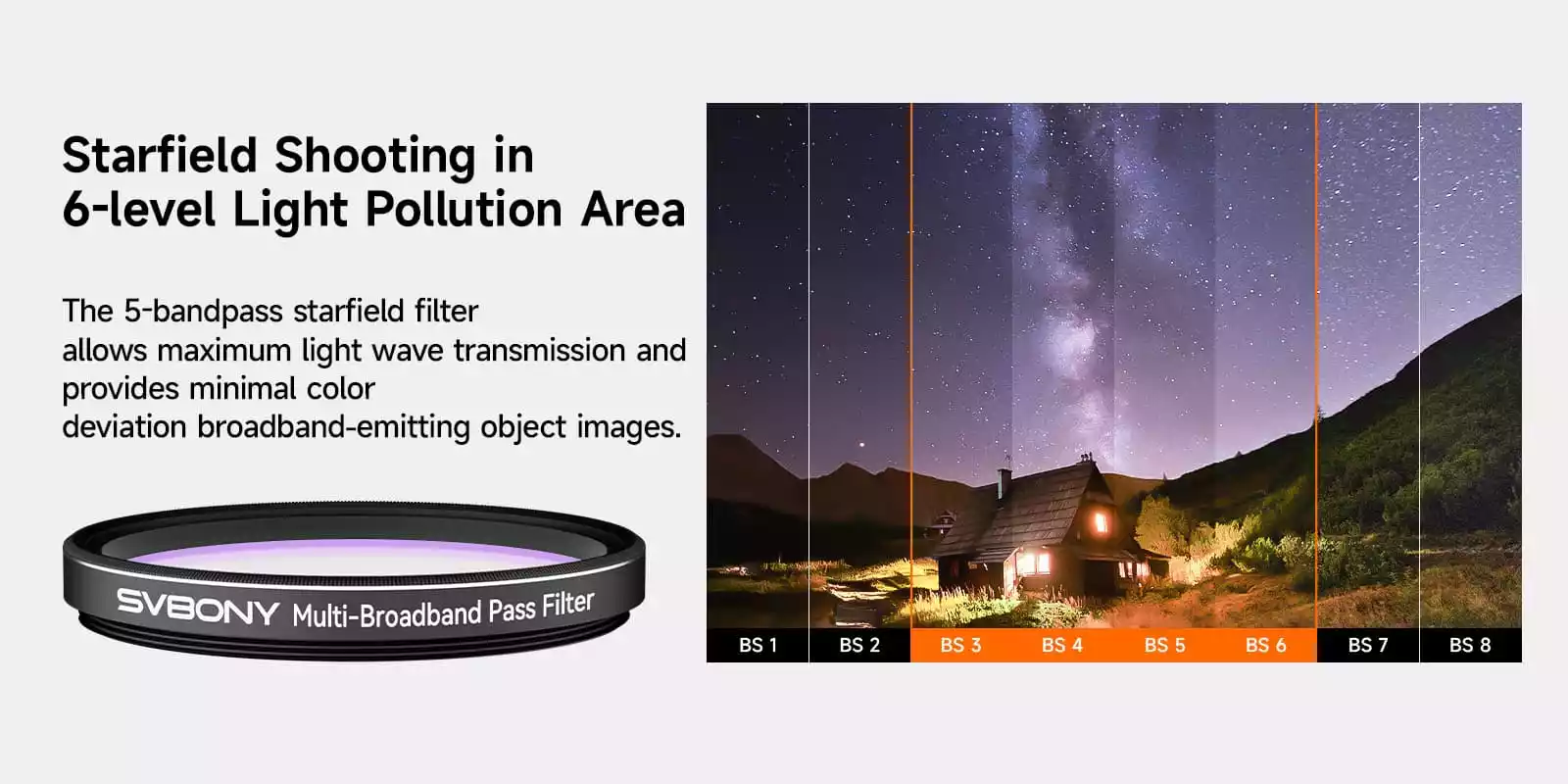 The Svbony SV260 multi-bandpass filter is a 5-bandpass broadband pass light pollution filter. Equipped with OD4 cut-off depth and over 90% peak transmittance, the filter is designed to isolate 6-level light pollution and make light wave transmission maximum to enhance deep-sky details and improve the visibility of deep-sky objects.