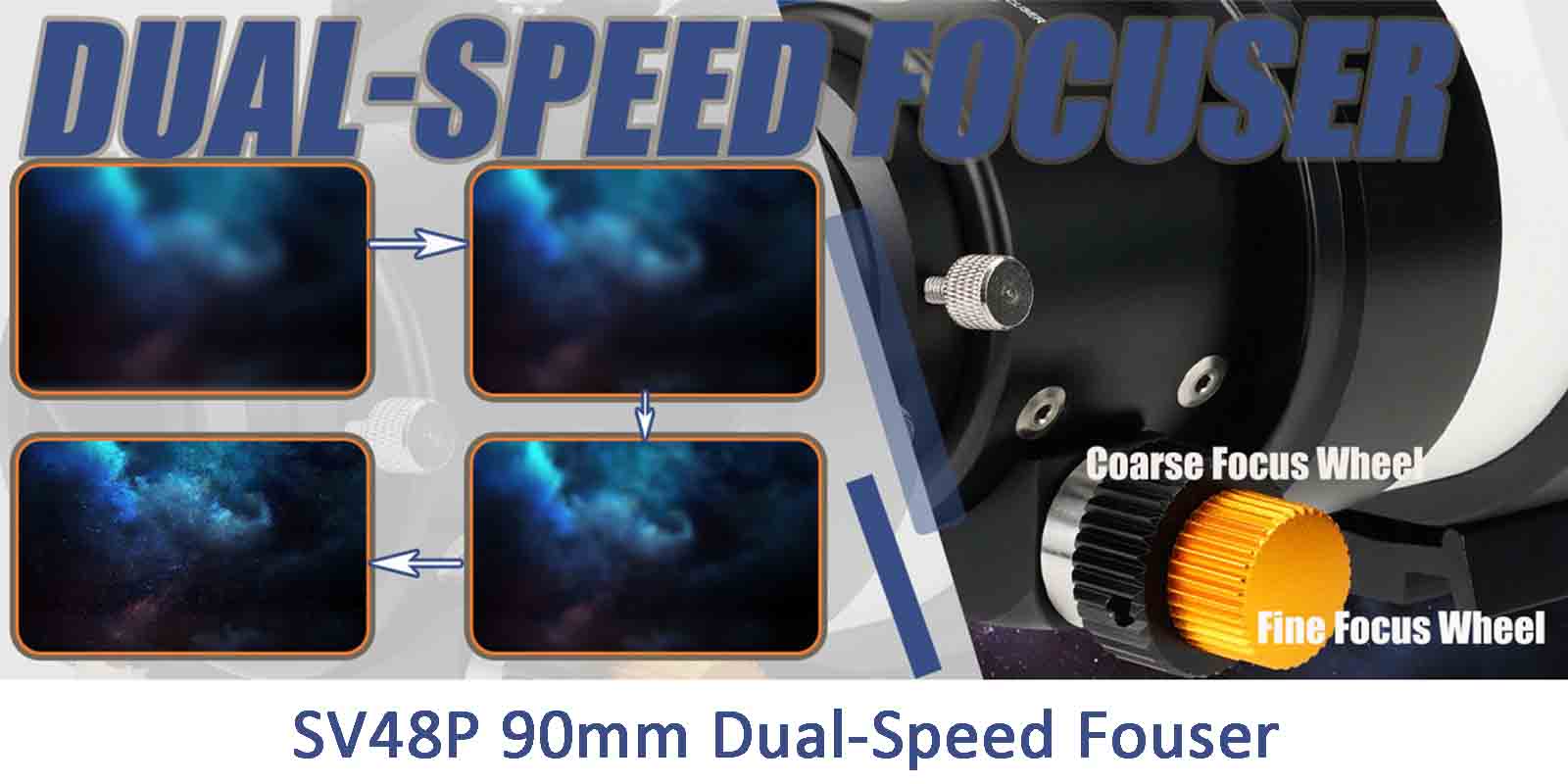 - Double speed focuser; the 2 inches rotatable double speed focuser; gear ratio of 1:10; precise adjustability for smooth operation