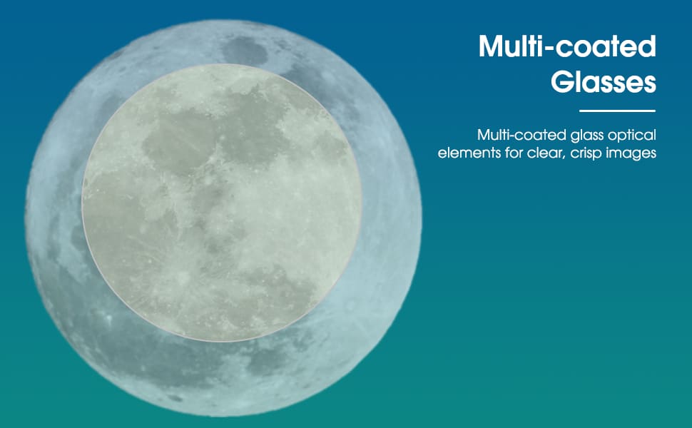 Multi-coated glass optical elements for clear, crisp images.