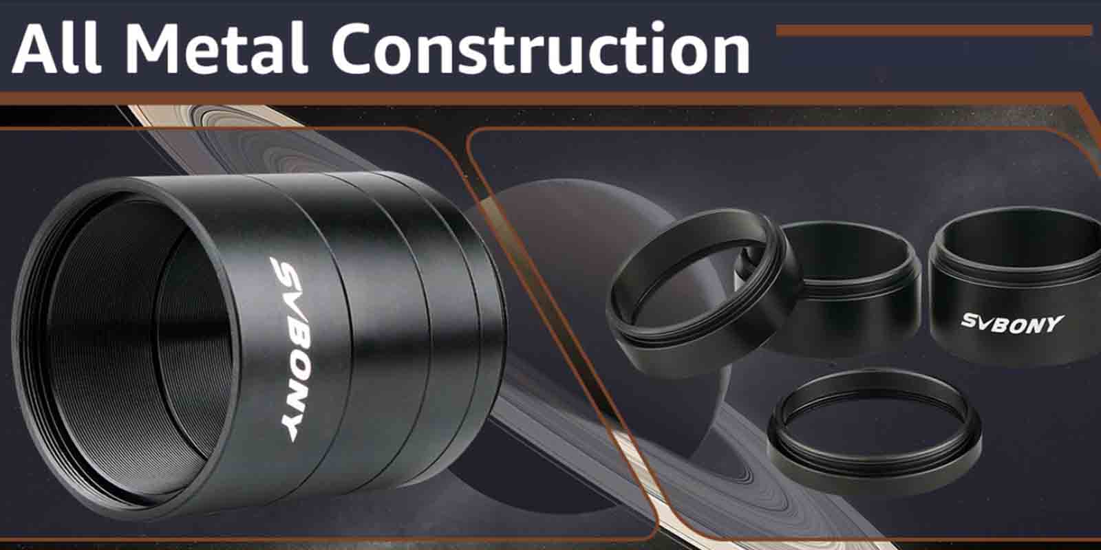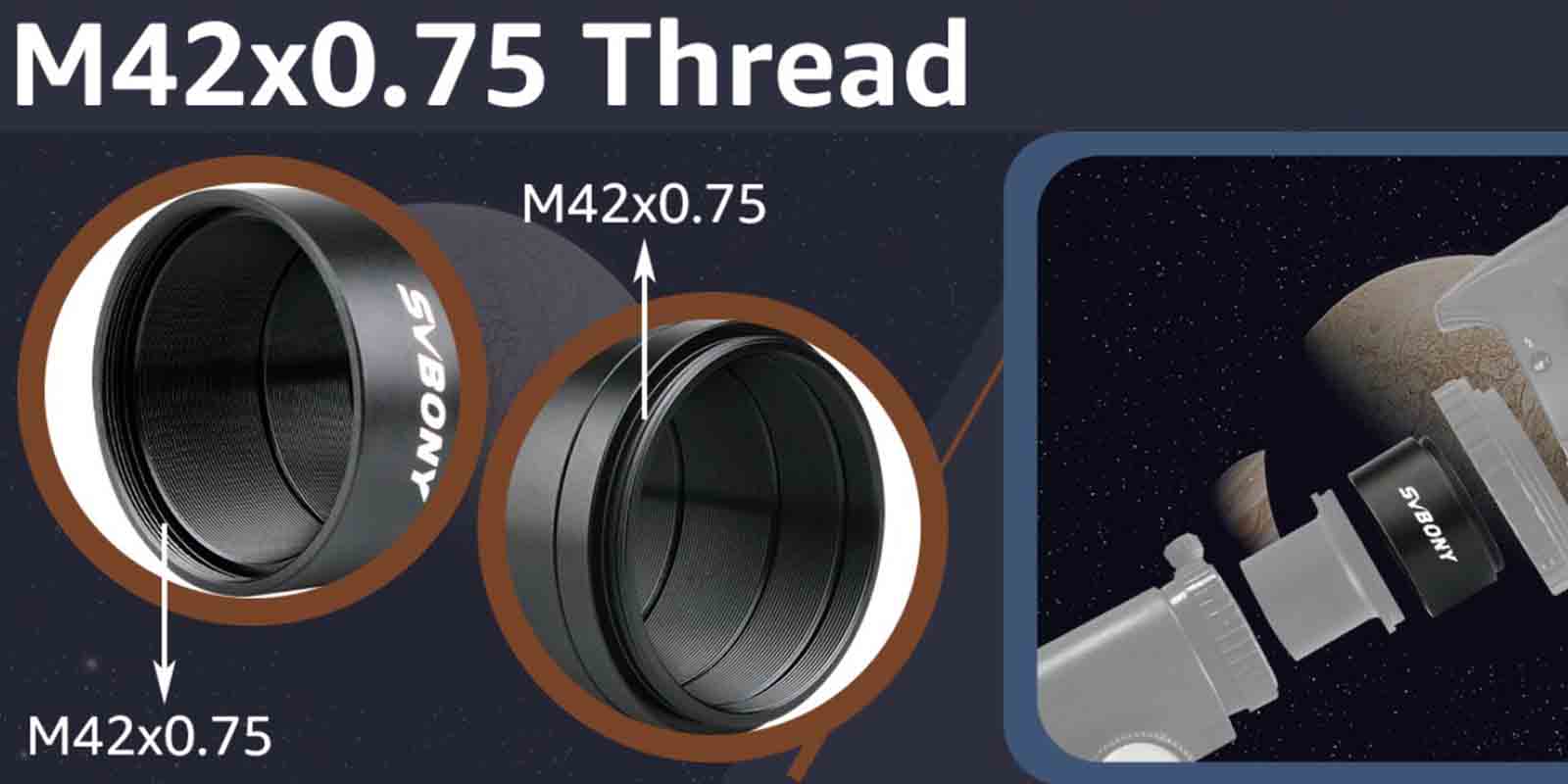 - T2 interior thread and T2 exterior thread for solving spacing problems in astrophotography and eliminates a range of focusing problems;