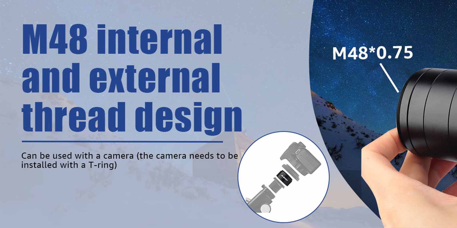 - Male thread and female thread both are M48*0.75mm;Solving spacing problems in astrophotography and eliminates a range of focusing problems;