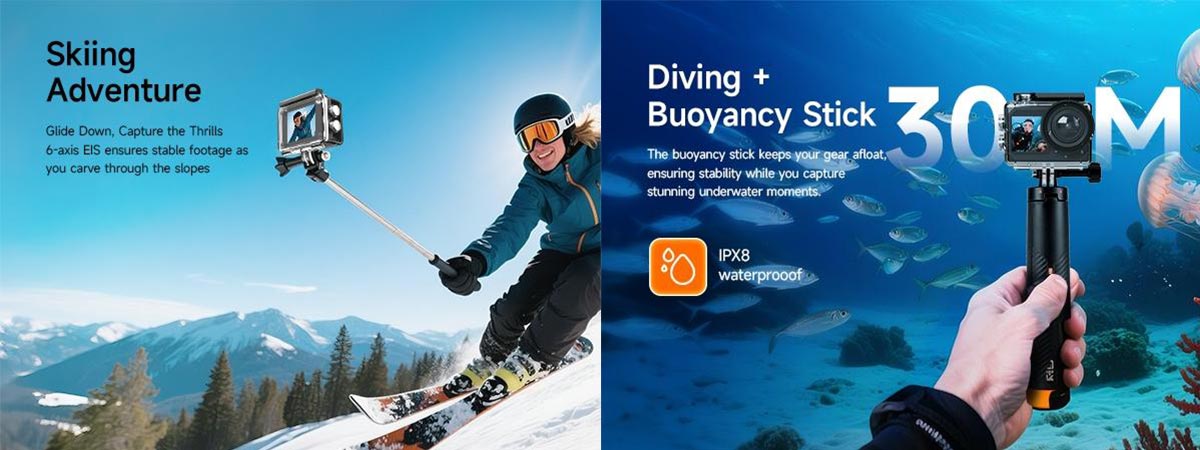- IPX8 30m underwater with case: IPX8-rated and waterproof up to 30m, the action camera features a leak-proof housing. Paired with a buoyant tripod, it stays afloat and stable—perfect for capturing clear underwater shots;